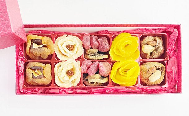 見た目にもきれいなドライフルーツを使用し、チョコレートのようなアソートで仕上げた他にはないギフトです。お花のようなドライフルーツとフルーツの甘酸っぱい香りで五感を刺激します。