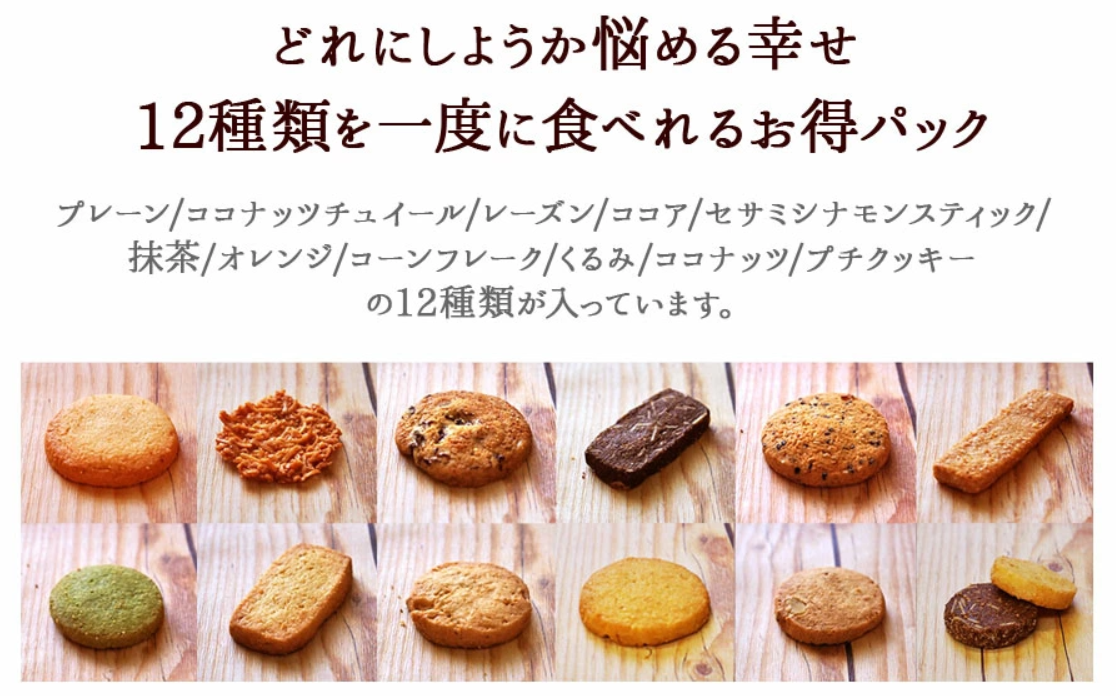 洋菓子屋さん自慢の12種のバラエティ豊かなクッキー。形のふぞろいや多少の割れ・かけを含みますが、たくさんの種類が楽しめます。北海道産よつ葉バターと、山口県産の卵を使い、濃厚で香ばしい12種を焼き上げています。