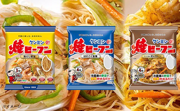 ケンミン焼ビーフン(鶏だし醤油)お米でできたしょうゆベースの味付けめんです。たっぷりの野菜と炒めるだけで手軽においしい焼ビーフンが召し上がりいただけます。