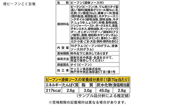 ケンミン焼ビーフン(こく旨塩)たっぷりの野菜を炒め、こく旨塩ソースと炒めるだけで塩味の焼ビーフンが召し上がりいただけます。チキンベースに「豚脂のこく」と「ホタテの風味」を加え、アクセントに「生姜」や「ごま油」の風味をバランスよく利かせました。