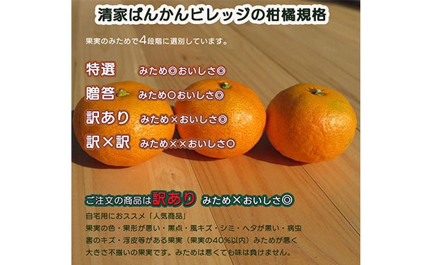 果実の色、果形が悪い、黒点、風キズ、シミ、ヘタが黒い、病虫害のキズ、浮皮等がある果実(果実の40%以内)みためが悪く大きさ不揃いの果実です。