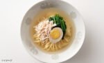 3、添付のスープは1袋に対して、熱湯250㏄~300㏄で希釈し、ゆであがった麺を入れ、お好みの具材をのせてお召し上がりください。