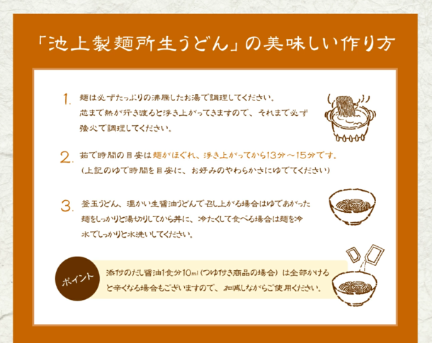 本場讃岐の名物、香川の名店「池上製麺所」のうどんが、ご自宅でもお楽しみいただけるようになりました!本場さぬきならではの強いコシが自慢!昔ながらの製法を守り、愛情をこめて作っているからこそ、1本1本の麺が生き生きとした輝きを見せ、もっちり弾力のあるコシの強さ、ツルツルとした喉越しに仕上がります。