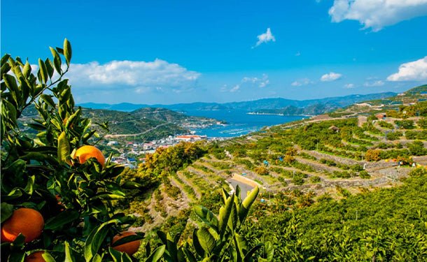 こだわりの原料:リアス式海岸の傾斜地に続く段々畑では降り注ぐ太陽と穏やかな宇和海に包まれ甘くて美味しいみかんが育ちます。