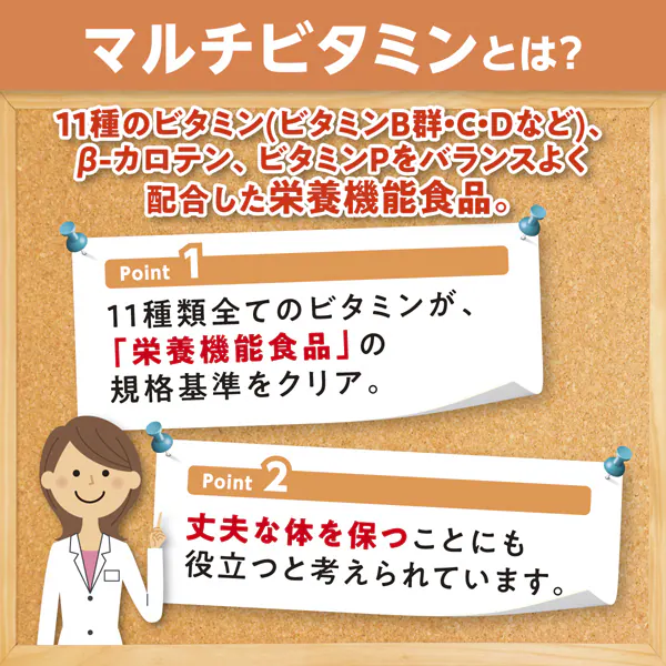健康と美容、若さを保つうえで欠かせないビタミン。「マルチビタミン」は、互いを助け合って働く12種類のビタミンを1粒にバランスよく配合したサプリメントです。ビタミンCの働きを助けるビタミンPもプラス。1日1粒で、手軽に補うことができます。
